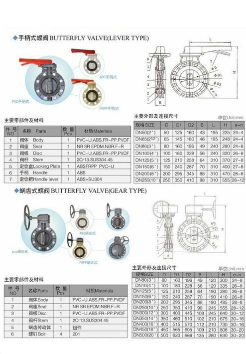 渦輪塑料蝶閥,手柄塑料蝶閥相關(guān)尺寸圖: