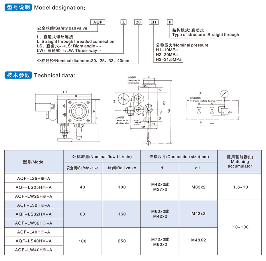 AQF安全球閥,AQF型安全球閥主要用于液壓一囊式蓄能器作為安全,斷流和卸荷的蓄能器附件。安全閥可保持系統(tǒng)中的壓力調(diào)定值。當(dāng)壓力調(diào)定值時,安全閥開啟,防止系統(tǒng)過載,特別是封閉系統(tǒng)中的蓄能器更不可缺少,而防止外負(fù)荷的突然加大所造成系統(tǒng)的危害。特點(diǎn):結(jié)構(gòu)緊湊、體積小,安全方便,操作簡單。
