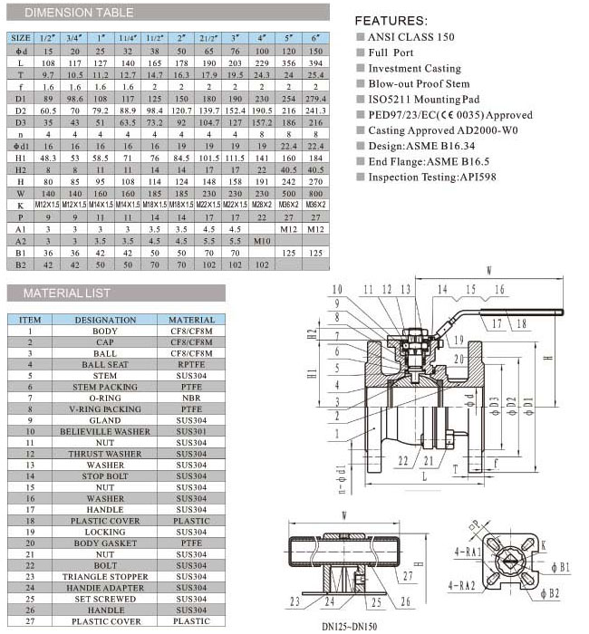 美標不銹鋼球閥,美標高平臺球閥ISOO 5211平臺設(shè)計 2片碟形彈簧自動壓緊填料 閥桿防飛出,防靜電 雙層閥桿填料符合TUV TA-LUFT的閥桿泄漏測試要求。 適用介質(zhì):水、氣、油品、天然氣和酸堿類腐蝕性介質(zhì)適用溫度:≤350℃ 驅(qū)動方式:手動、蝸輪傳動、氣動、電動、液動等。