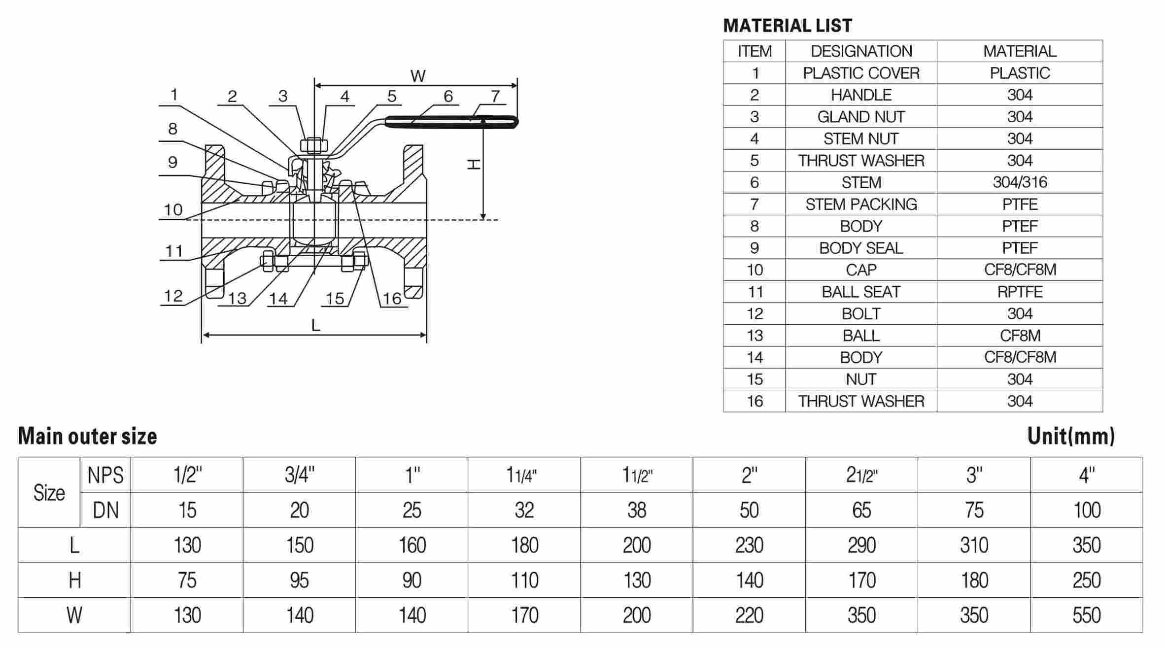 三片式法蘭球閥適用介質(zhì):水、油、氣及某些腐蝕性液體(W.O.G)用穩(wěn)定范圍:-20~232℃~350℃公稱壓力:1.6-4.0MPa