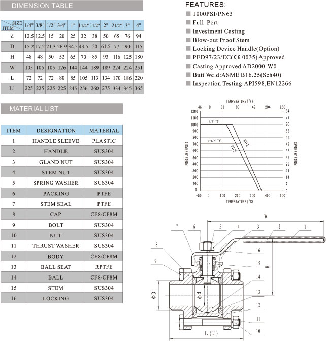 三片式對焊球閥適用介質(zhì):水、油、氣及某些腐蝕性液體(W.O.G)用穩(wěn)定范圍:-20~232℃~350℃公稱壓力:1.6-4.0MPa