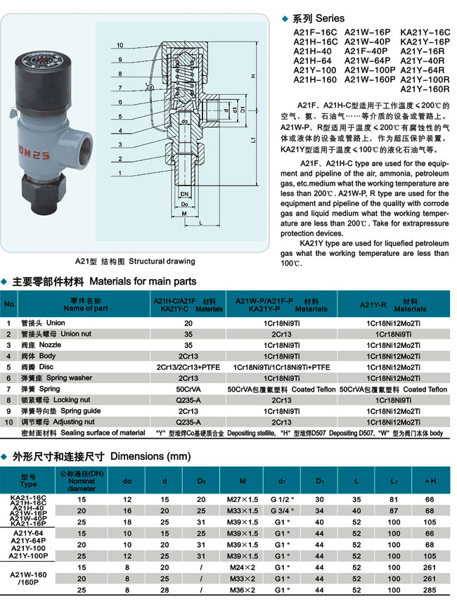 A47,A21,A41,A27,A61 H/Y彈簧微啟式安全閥主要零部件材料
