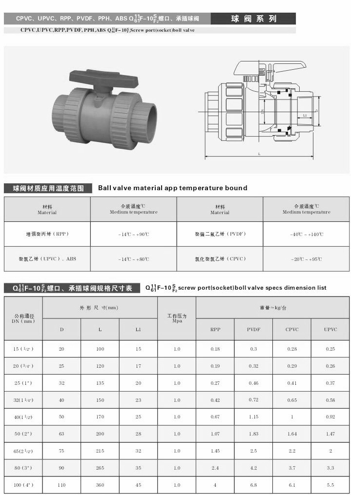 UPVC塑料球閥,UPVC球閥主要用于截斷或接通管路中的介質(zhì),亦可用用于流體的調(diào)節(jié)與控制,它與其它閥 類相比,具有以下一些特點。流體阻力小、球閥是所有閥類中流體阻力小的一種,即使是縮徑球閥,其流體阻力也相當小。而UPVC球閥是根據(jù)各種腐蝕性管道流體需求的一種材料球閥產(chǎn)品。產(chǎn)品:閥體重量輕、耐腐蝕性強,外型結(jié)構(gòu)緊湊美觀,本體重量輕容易安裝,耐腐蝕性強,應(yīng)用范圍廣,材質(zhì)衛(wèi)生無毒,耐磨損、容易拆卸,維護簡單易行。